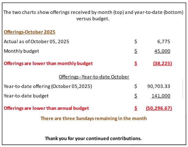 The Leadership Council has scheduled a Voters’ Meeting for Sunday, November 2, 2025, immediately following service. Our primary agenda item will be to elect Leadership Council Members and Elders. We will provide a slate of candidates once nominees are finalized. Additionally, we will be providing our quarterly update regarding the congregation’s finances. We look forward to seeing everyone!